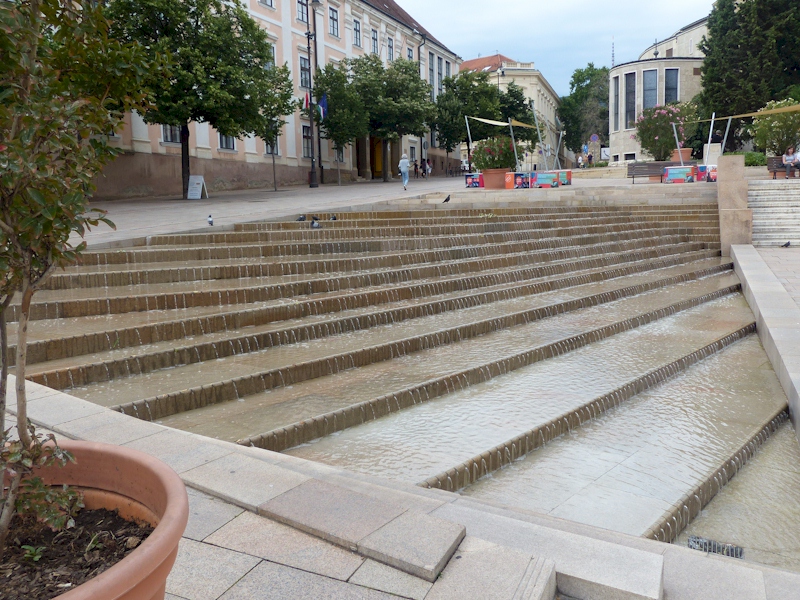 Dieser Platz verzaubert jeden Besucher durch seine Weite, seine spezielle Lage (der Platz steigt in Richtung des Mecsekgebirgesauf), mit seinen Wasserelementen, gepflegten Sitzbänken und natürlich