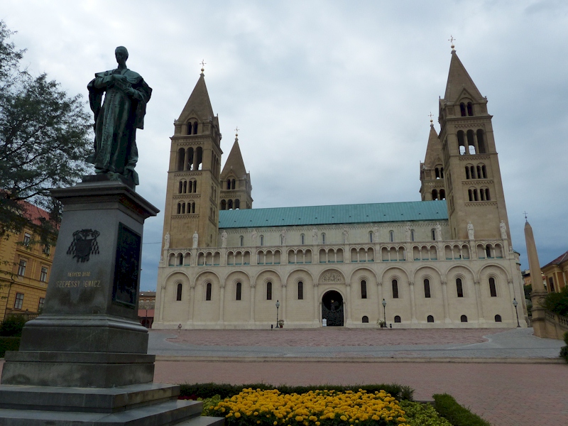 | Die Spuren des Mittelalters sind in Pécs hauptsächlich rund um den Dom sichtbar. Letzterer ist die größte romanische Kirche in ganz Ungarn. Sie liegt an einem großen Platz, wo sich auch der Bischöfliche Palast befindet. An der Nordseite des Doms ist ein Teil des mittelalterlichen Walls der Stadt begehbar. Weiter westlich steht der Barbakán, ein großartig restaurierter Festungsturm aus dem 15. Jahrhundert. |