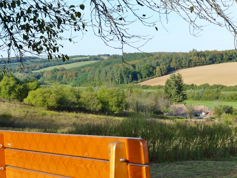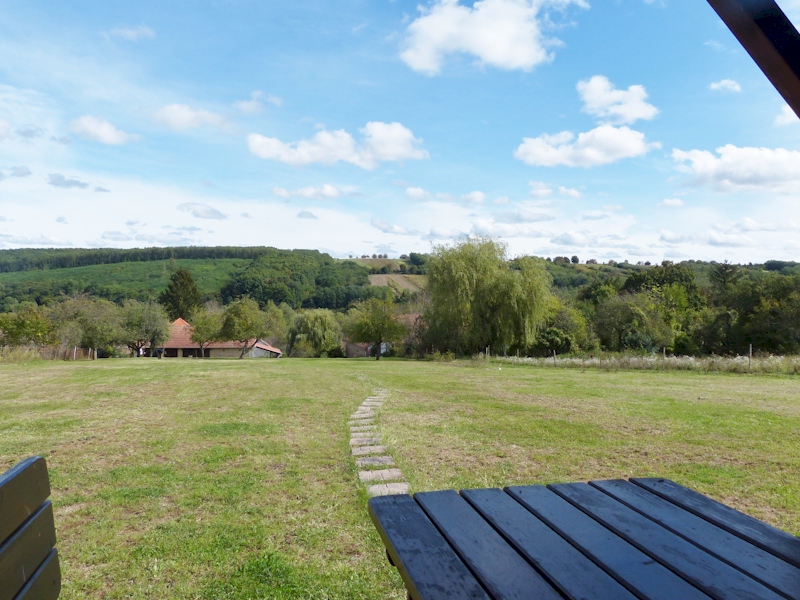 Covered terrace with built-in wooden bench and table (6 m²) near the top of the garden.